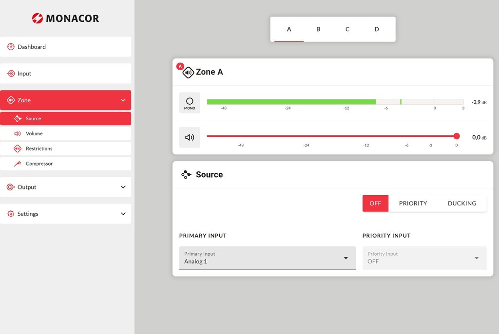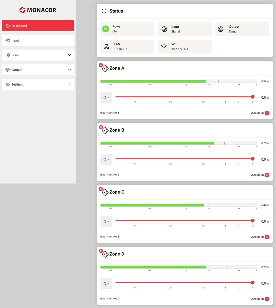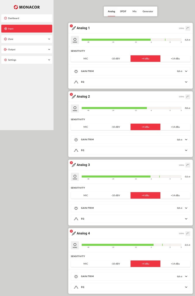 • 8 outputs (4/8 Ω) or 2 zone outputs (100 V) via plug-in screw terminal